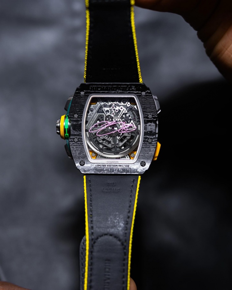 球速直播6月22日讯 詹姆斯晒出了属于他的理查米尔RM65-01腕表,而他本人带的则是限量150枚中编号为1的那一枚。 詹姆斯也感谢品牌让他有机会参与打造一款属于他个人的腕表,表面12点位置有他的皇冠logo,背透的后表壳则有他的签名。 据网上信息,同款普通版本的售价大约在38万美元。
