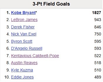 球速直播11月16日讯 湖人客场119-95大胜雄鹿。 本场比赛里夫斯命中5记三分,湖人生涯三分数523记,超越波普升至队史第七位。湖人队史三分命中数最多的是科比的1827记,第二是詹姆斯的943记。