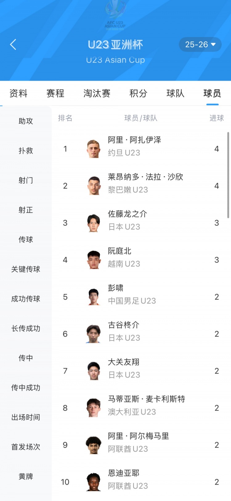 球速直播1月24日讯 U23亚洲杯决赛,U23国足将与日本U23队争夺冠军。截至决赛前,U23国足球员彭啸攻入2球,并列本届亚洲杯射手榜第五,日本U23队共有3人进入射手榜前十。 U23亚洲杯射手榜(截止决赛前) 1 阿里.阿扎伊泽 4球 约旦U23队 2 莱昂纳多.法拉.沙欣 4球 黎巴嫩U23队 3 佐藤龙之介 3球 日本U23队 4 阮庭北 3球 越南U23队 5 彭啸 2球 中国U23队 6 古谷柊介 2球 日本U23队 7 大关友翔 2球 日本U23队 8 马蒂亚斯.麦卡利斯特 2球 澳大利亚U23队 9 阿里.阿尔梅马里 2球 阿联酋U23队 10 恩迪亚耶 2球 阿联酋U23队