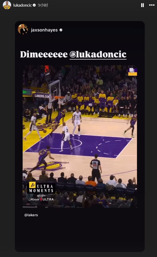 球速直播3月19日讯 昨日湖人主场125-109战胜马刺。 今天,中锋海斯和控卫东契奇相互转发了两人昨日的精彩配合。