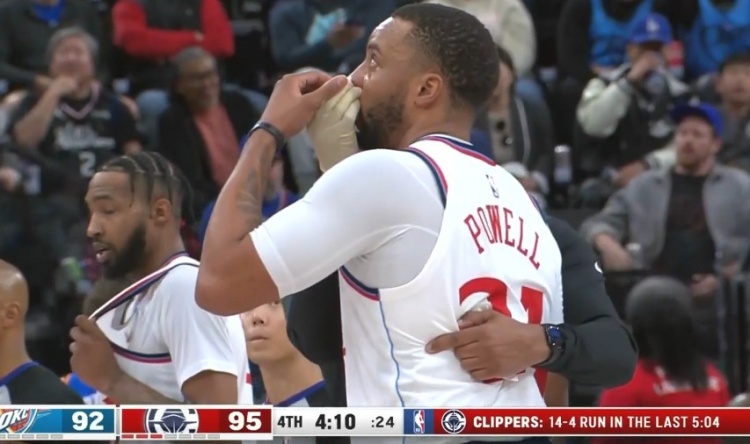 真正的“血帽”!鲍威尔上篮遭亚历山大封盖 被打到鼻子血流不止