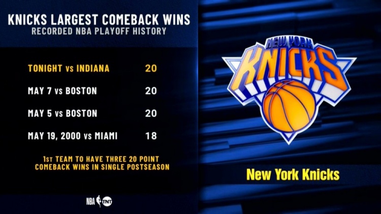 球速直播5月26日讯 东决G3,尼克斯客场20分逆转106-100击败步行者,大比分1-2落后。 据统计,尼克斯本场曾35-55最多落后20分,最终完成逆转,追平了队史季后赛最大逆转分差,这也是他们第三次在季后赛完成20分逆转。 他们也成为NBA历史上第一支在单个季后赛中完成三次20分逆转胜利的球队!