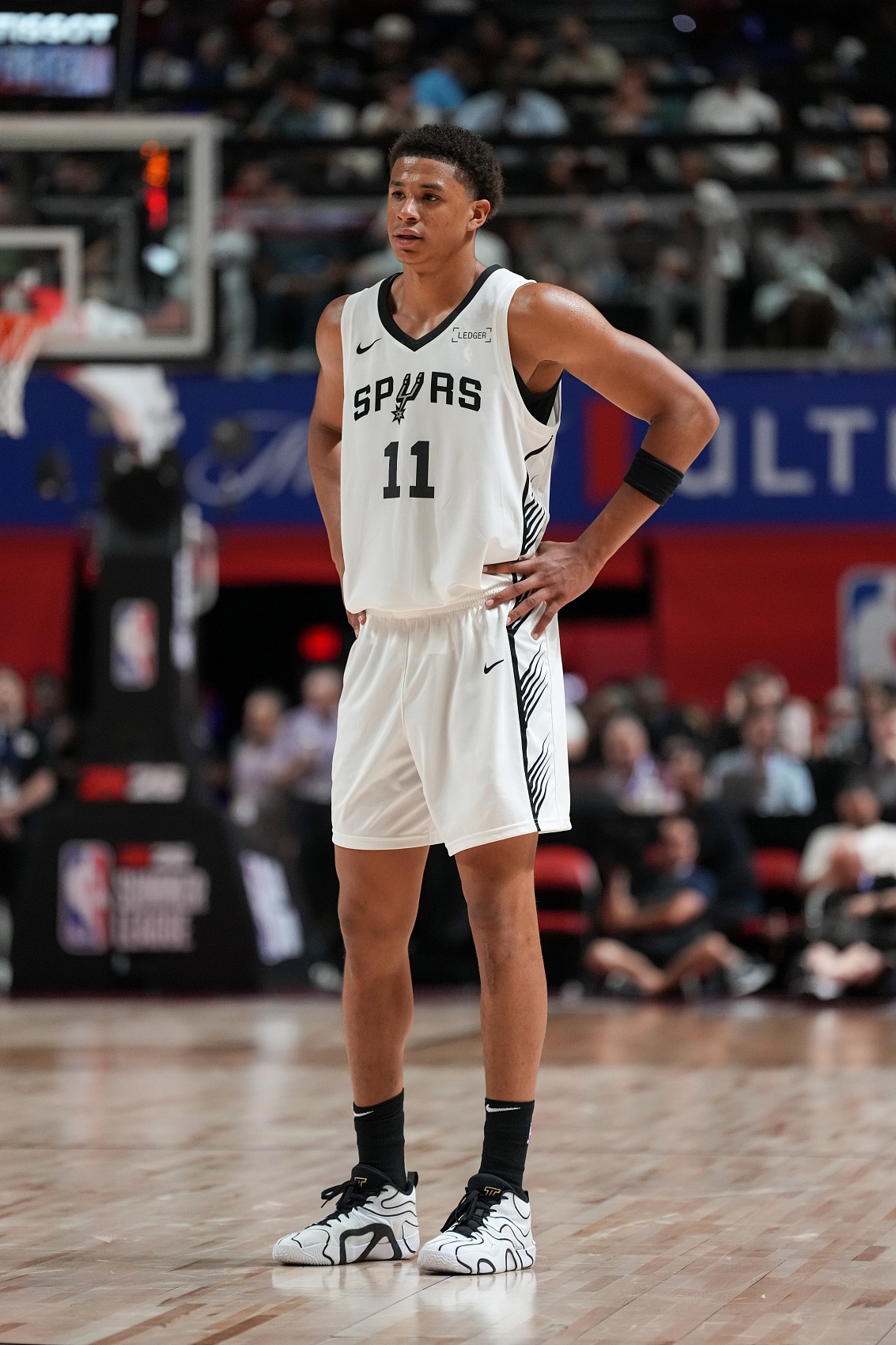 球速直播7月15日讯 NBA夏联,马刺93-91加时胜爵士。 此役,马刺14号秀卡特-布莱恩特再次体现出守强攻弱的特点。他11投2中,三分3中0,罚球2中1,仅得5分。 但防守端可圈可点,拼下了5篮板1抢断2盖帽。