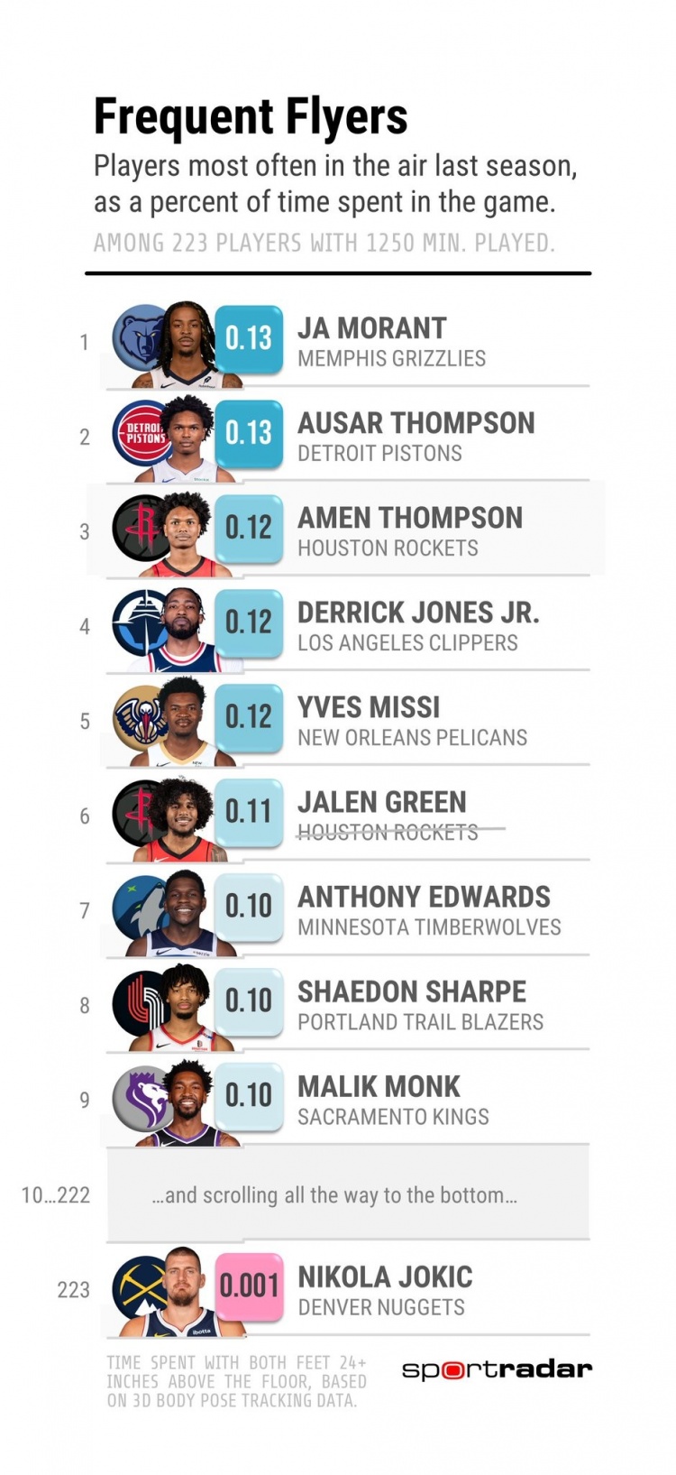 美媒统计了上赛季球员滞空时间在上场时间中所占的比例,其中莫兰特0.13%排名第一,奥萨尔-汤普森第二,阿门-汤普森第三,杰伦-格林第六,爱德华兹第七。 掘金中锋约基奇滞空时间0.001%,稳居倒数第一! (该统计覆盖上赛季出场时间超过1250分钟的223名球员)