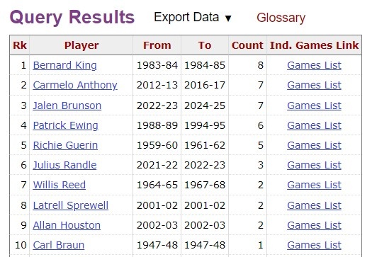 球速直播12月22日讯 NBA常规赛,尼克斯132-125力克热火。布伦森出战38分钟,26中15,三分13中6,罚球11中11,砍下赛季新高47分(此前最高40分),外加3篮板8助攻,正负值+10。 根据数据统计,这是布伦森尼克斯生涯第8次45+,他追平伯纳德·金,并列队史45+场次榜第一。