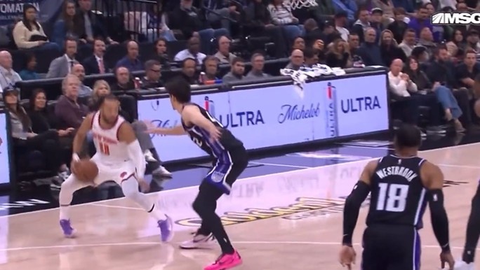 意外状况!布伦森胯下运球时自己扭到右脚 目前已经回到更衣室
