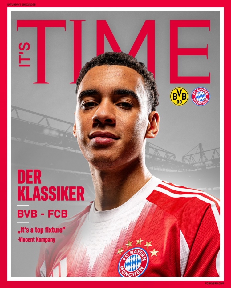 球速直播2月28日讯 北京时间3月1日凌晨1点30分,德甲第24轮,拜仁客场挑战多特蒙德。赛前,拜仁官方社革发布本轮德甲“国家德比”的赛前海报。 拜仁本次发布的海报设计独具匠心,采用了知名杂志《TIME》的封面风格。拜仁前锋穆西亚拉身着球队红白战袍占据封面,海报上方印有醒目的红色大字“IT'S TIME”,下方则用德语标注"经典对决”,并配上了主帅孔帕尼的评价:“这是一场顶级较量”。